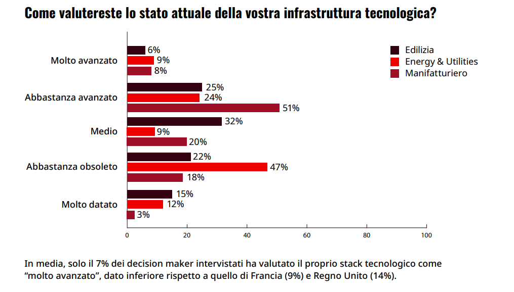 La consapevolezza del problema è tuttavia alta: l’84% delle aziende edili e il 91% delle utility riconoscono che i sistemi legacy rappresentano un freno concreto allo sforzo innovativo.
