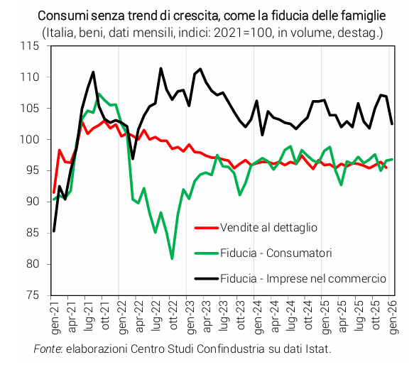 Migliora anche la fiducia dei consumatori che, tuttavia, non si traduce ancora in un aumento degli acquisti. A dicembre, infatti, le vendite al dettaglio hanno segnato una flessione dello 0,9% in volume, confermando una fragilità della domanda che zavorra l’attività industriale, in particolare nei settori legati ai beni di consumo.