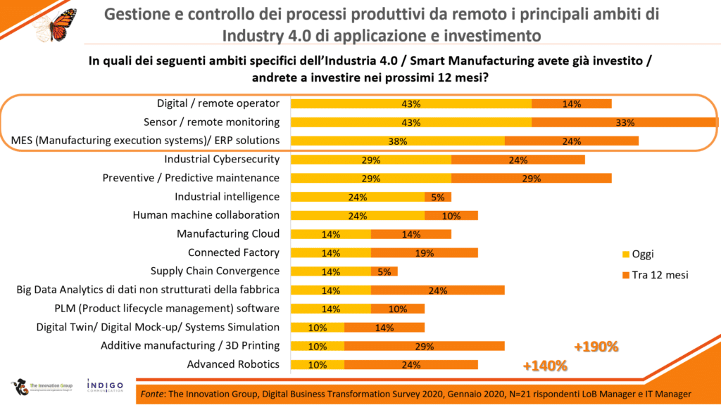 - Per il 43% delle aziende (con un’ulteriore adozione del 14%): Digital / remote operator, ossia la possibilità di abilitare gli operatori di fabbrica con capacità avanzate, digitalizzazione, visualizzazione avanzata, operatività da remoto