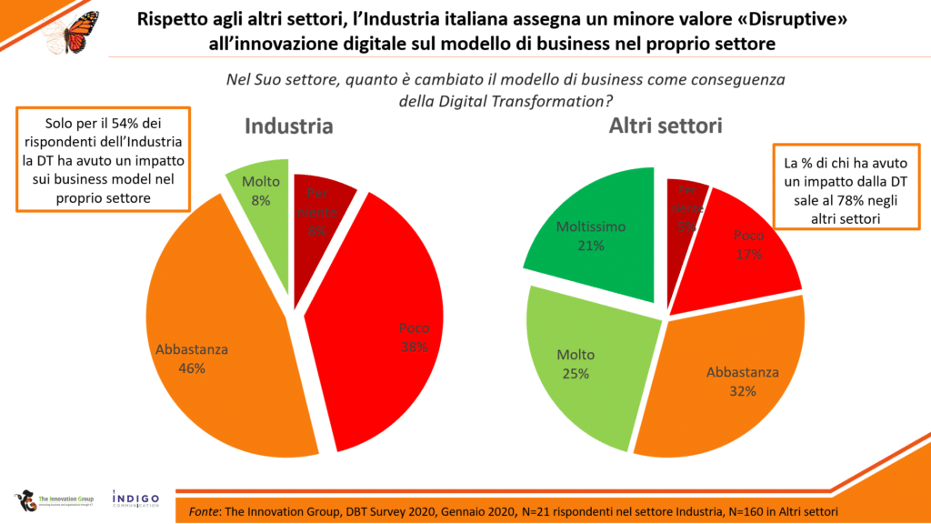 Secondo la ricerca, il settore industriale è stato finora poco impattato dalla trasformazione digitale in corso, molto meno di altri. Come mostra la figura successiva, alla domanda “Nel suo settore è cambiato il modello di business come conseguenza della Digital Transformation?” l’84% delle imprese manifatturiere ha risposto Poco o Abbastanza, quando la risposta sugli intervistati di tutti gli altri settori, raggiungeva nella quasi metà dei casi punteggi molto più alti: Molto e Moltissimo.