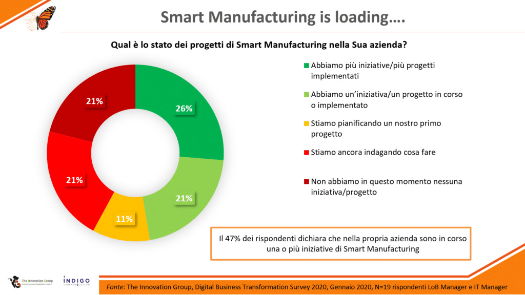 Grazie a una nuova disponibilità di Big Data provenienti dal basso e di capacità per un’orchestrazione e un’ottimizzazione dell’esecuzione. The Innovation Group, all’interno della propria DBT Survey di gennaio 2020, ha rivolto ai rispondenti del settore industriale alcune domande specifiche sui progetti di Smart Manufacturing in corso. È emerso che in questo momento, la situazione è ancora molto differenziata: