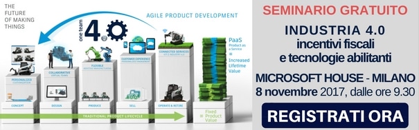 È in programma l’8 novembre 2017 a Milano il seminario gratuito “Industria 4.0: incentivi fiscali e tecnologie abilitanti” organizzato da OneTeam. L’evento si terrà presso il Microsoft Technology Center di Viale Pasubio, 21.