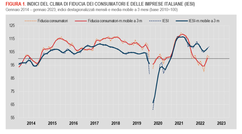 Il clima di fiducia delle imprese aumenta per il terzo mese consecutivo raggiungendo un livello superiore alla media del periodo gennaio-dicembre 2022.