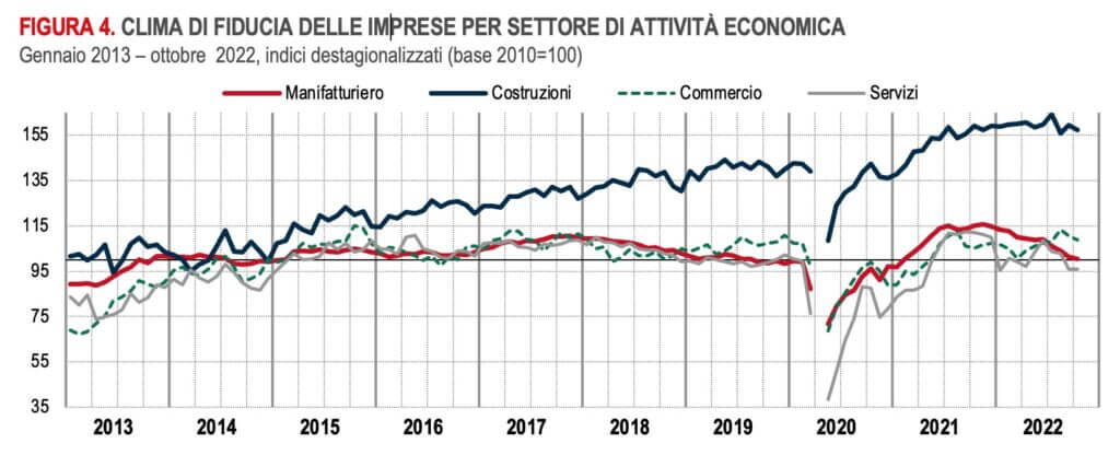 L’indice composito del clima di fiducia delle imprese subisce un calo minore, passando da 105,1 a 104,5, ma si tratta del quarto calo consecutivo. In realtà è da inizio anno che le cose non vanno come lo scorso anno: l’indice, dopo la marcata crescita registrata nel corso del 2021, ha iniziato a calare a gennaio 2022 per entrare poi in un periodo di stasi fino a giugno e riprendere a calare da luglio a oggi.
