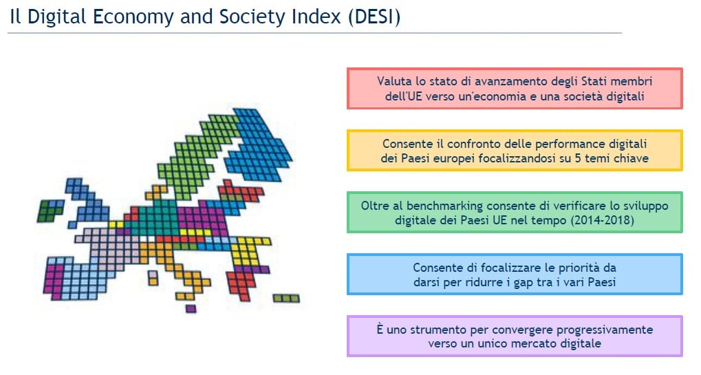 Secondo gli ultimi dati del Digital Economy and Society Index (Desi), l’Indice dell’Unione europea con cui sono misurati i progressi degli Stati membri, l’Italia è quartultima (25esima su 28) per risultati raggiunti nell’attuazione della propria Agenda Digitale. Lontana da Paesi come Regno Unito, Spagna, Germania e Francia. Ha perso posizioni in connettività (26esimo posto), capitale umano (25esimo) e digitalizzazione delle imprese (20esimo). Mentre conserva il penultimo posto nell’area dell’uso di Internet, e il 19esimo in quella dei servizi pubblici digitali.