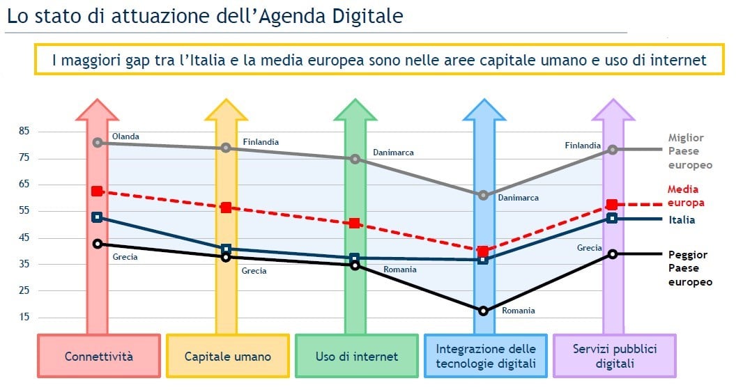 La trasformazione digitale del Paese è un’impresa titanica, qualcosa è stato fatto e si sta facendo, ma il lavoro da realizzare per la cosiddetta Agenda Digitale è ancora grande. Come il divario da colmare nei confronti degli altri Paesi europei.