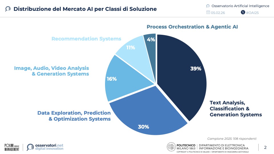 Al secondo posto resistono le soluzioni di Data Exploration, Prediction & Optimization (30%), fondamentali per le analisi predittive, seguite dai sistemi per la generazione e analisi di Immagini, Video e Audio (16%), un ambito in forte crescita. Chiudono la classifica i sistemi di raccomandazione (11%) e le soluzioni di Process Orchestration & Agentic AI (4%), ancora una nicchia ma destinata a guidare l’innovazione futura.