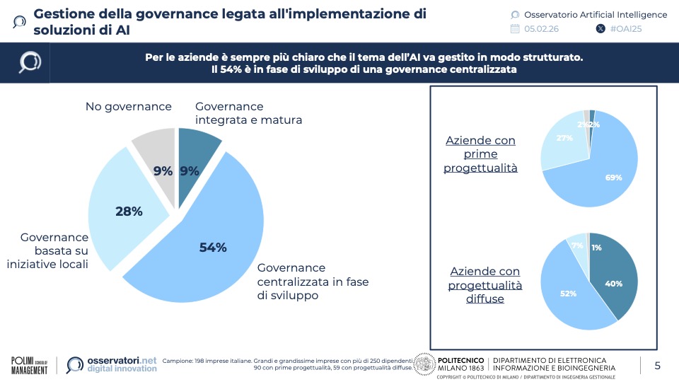 L’adozione di massa di strumenti pronti all’uso sta però generando un fenomeno di Shadow AI difficile da ignorare: otto lavoratori su dieci utilizzano strumenti non forniti ufficialmente dall’organizzazione, esponendo le imprese a rischi di sicurezza e perdita di controllo sui dati. Solo una ristretta minoranza delle grandi imprese, circa il 9%, dichiara di avere oggi una governance strutturata e allineata ai principi etici e agli obiettivi aziendali.