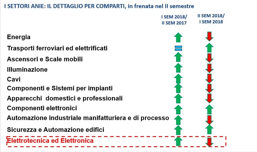 Guardando ai numeri, e ai dati congiunturali relativi al fatturato totale delle imprese Anie, a una crescita del 6% tra il primo semestre 2018 e quello precedente, è seguito nel secondo semestre 2018 un calo del 3,2%.