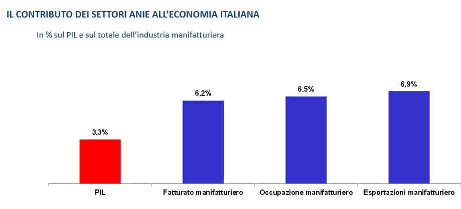 Il contributo del mercato e delle attività delle associate Anie rappresenta il 3,3% del Pil nazionale, il 6,2% del fatturato complessivo del manifatturiero, il 6,5% degli occupati del manifatturiero, e il 7% del suo Export.