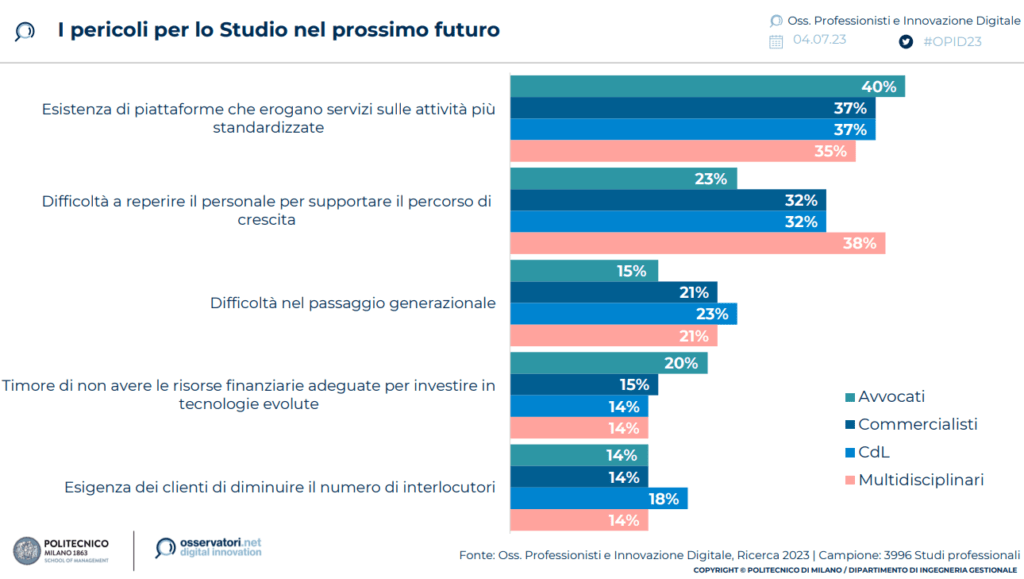 E il principale pericolo per il futuro, secondo i professionisti è rappresentato dalle diverse piattaforme digitali, alcune delle quali ricorrono anche all’intelligenza artificiale, che potrebbero erogare servizi sostituendo le attività più standardizzate, evidenziato dal 40% degli avvocati, 37% di commercialisti e consulenti per il lavoro e 35% dei multidisciplinari.