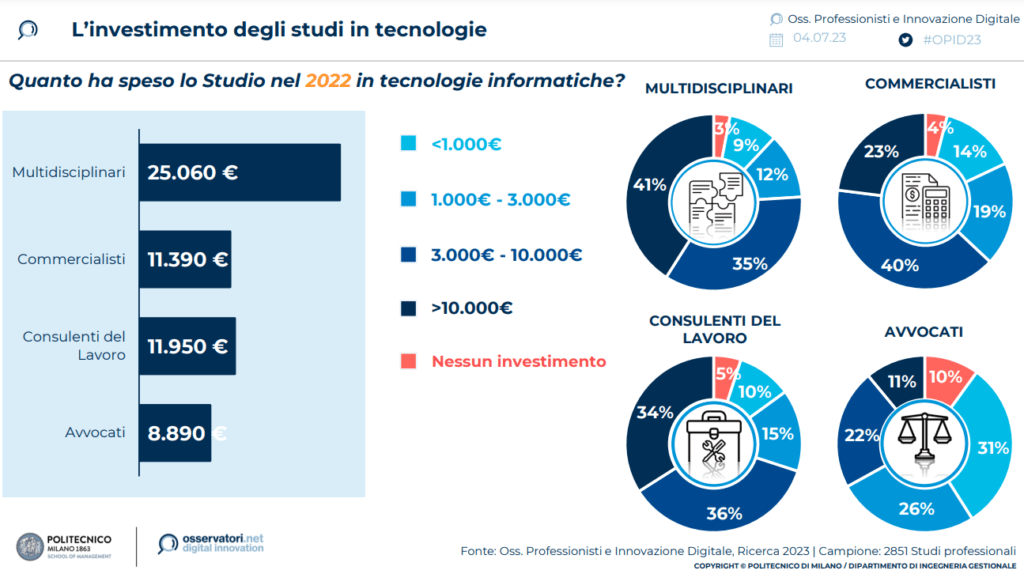 Il 41% degli studi multidisciplinari investe più di 10.000 euro, contro il 34% dei consulenti del lavoro, il 23% dei commercialisti e solo l’11% degli avvocati.
