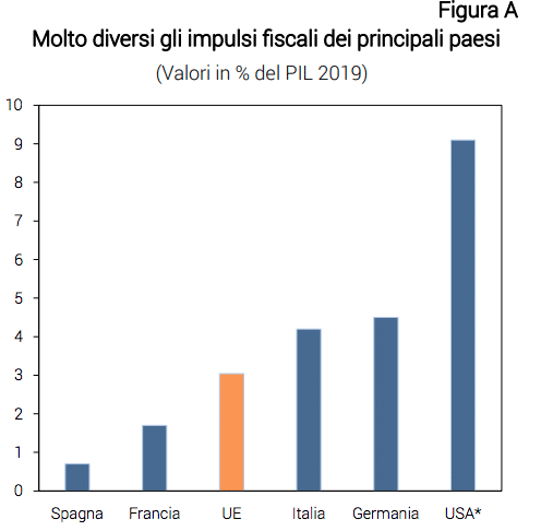 Confindustria infatti inserisce queste tra le “misure di impulso fiscale, quelle che i beneficiari non dovranno rimborsare”. Considerando solo queste ultime, l’impulso fiscale dell’Italia sarebbe “inferiore a quello della Germania (4,5 punti di Pil del 2019) ma sopra alla media UE (3 punti): 4,2 punti di Pil 2019 contro 1,7 della Francia e 0,7 della Spagna”.