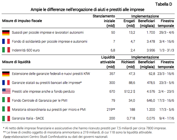 Per quanto riguarda invece i sussidi, il Centro Studi di Confindustria fa notare che “la Germania ha erogato oltre 13 miliardi di euro di aiuti a piccole imprese e autonomi (in circa due mesi) contro i 4,7 della Francia (erogati in poco più di 2 mesi) e i 2,4 dell’Italia (per il solo mese di marzo e solo alle partite Iva)”.