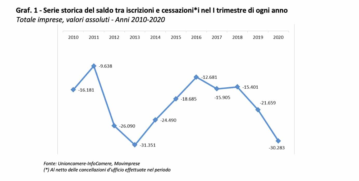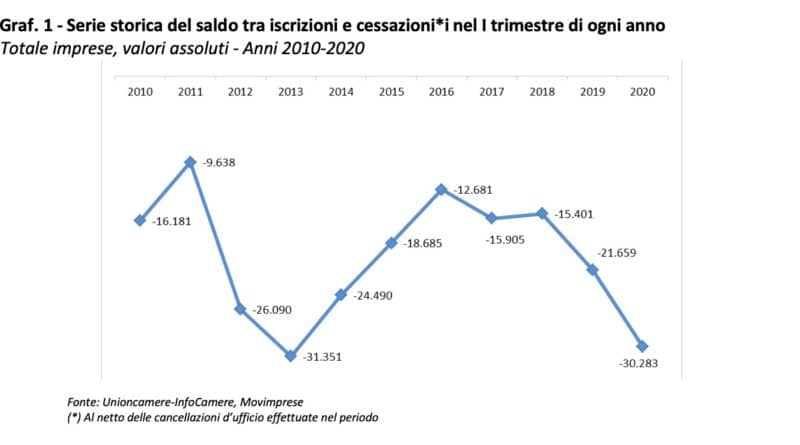 Un grafico che punta verso il basso: un’immagine che ben rappresenta la situazione del tessuto imprenditoriale italiano a causa dell’epidemia da coronavirus. L’allarme arriva da Unioncamere: quasi trentamila imprese in meno nei primi tre mesi del 2020, contro un calo di ventuno mila nello stesso trimestre del 2019. Il saldo di 9000 imprese in più che sono sparite dai radar tra gennaio e marzo di quest’anno risente delle restrizioni seguite all’emergenza covid-19 e rappresenta il risultato peggiore degli ultimi sette anni, rispetto allo stesso arco temporale.
