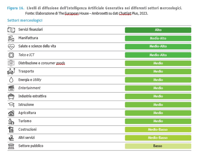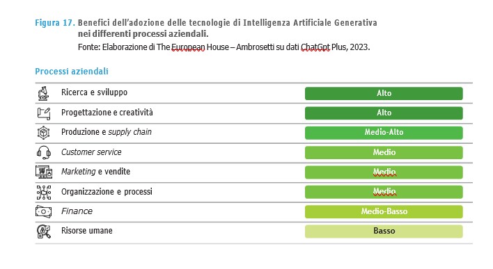 Da questa premessa nasce la convinzione che il nostro Paese abbia effettivamente bisogno dell’intelligenza artificiale generativa, considerata come uno strumento trasversale “in grado di aumentare il valore aggiunto e la produttività. Lo studio si è dunque ripromesso di verificare rispetto a tutti i settori produttivi quale sia l’impatto effettivo, quali siano i processi maggiormente impattati e quale sia il livello di maturità attuale”.