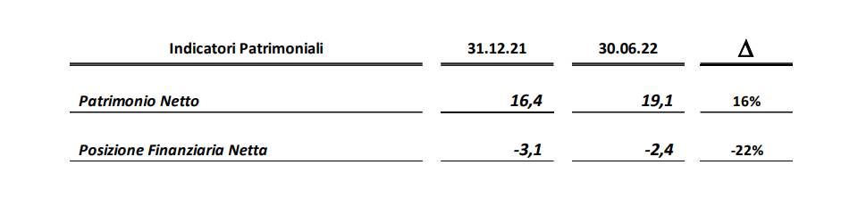 Si rafforza il Patrimonio Netto Consolidato, che passa dai 16,4 milioni del 31 dicembre 2021 ai 19,1 milioni di euro del 30 giugno 2022.