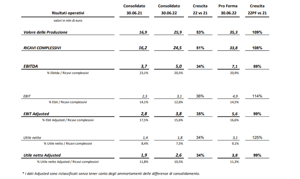 L’utile netto consolidato aumenta a 1,8 milioni (era 1,4 milioni euro nel 2021). L’utile netto Adjusted, misurato sui 6 mesi pro-formati, ammonta a 3,8 milioni, anche in questo caso il doppio del semestre precedente (quando valeva 1,9 milioni di euro).