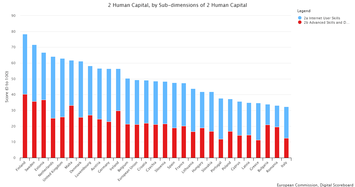 Il rapporto evidenzia invece gravi carenze per quanto riguarda la dimensione “capitale umano”. In questa specifica dimensione, di cui fanno parte le competenze di base per l’uso di internet da parte della popolazione e le competenze più avanzate, l’Italia è ultima in Europa. Scendendo nel dettaglio, l’Italia è ultima per numero di laureati nelle discipline dell’ICT, ma anche in tutte le altre sottodimensioni è parecchio al di sotto della media UE.