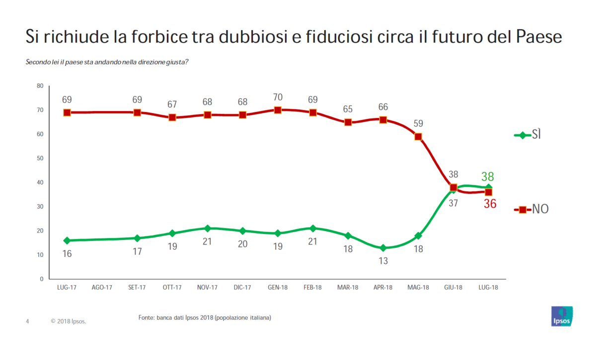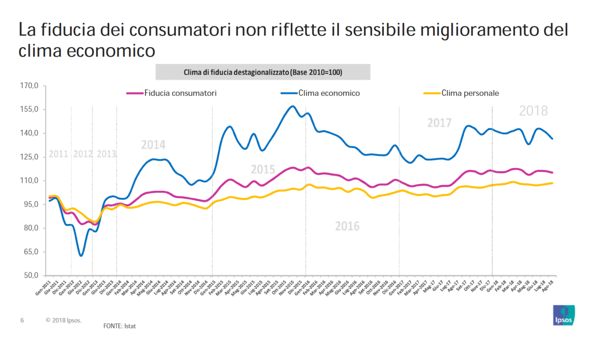Inutile dire che possiamo fare di più, certamente è così, ma dire che dobbiamo aumentare la nostra considerazione come italiani non è così scontato. Pagnoncelli osserva che l’immagine del nostro paese è migliore all’estero di quanto non sia nella penisola. I cittadini di altri paesi sanno apprezzare i nostri pregi più di quanto non sappiamo fare noi. Stiamo pagando il prezzo di uno storytelling negativo del nostro paese dal quale non sappiamo liberarci e che ci accompagna da lungo tempo. Per fortuna al di là delle Alpi non è questo l’atteggiamento dominante, al contrario, ma la propensione italiana a portare l’attenzione su difetti e criticità lascia il segno anche nel fatto che il clima economico, frutto comunque di sforzi importanti, non ha quell’effetto di trascinamento nella fiducia dei consumatori che aiuterebbe a “correre di più e meglio“.