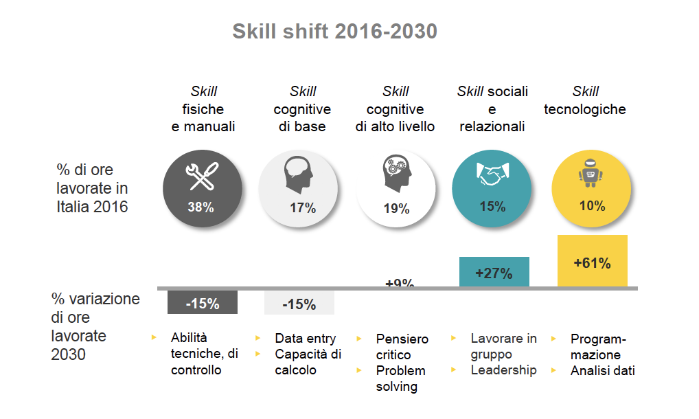 La trasformazione digitale non si esaurisce nella digitalizzazione di fabbriche e uffici. Fenomeni come Intelligenza artificiale e blockchain, solo per citarne due dei motori di questa trasformazione, avvengono solo si creano le condizioni perché ci siano soggetti con skill adeguati in grado, come abbiamo visto, di realizzare e portare queste soluzioni nei processi aziendali. E’ in corso uno skill shift che ha bisogno di essere alimentato con l’arrivo di nuove figure sostenute da forti competenze. E non è solo una questione di tecnologia, anzi, si vede crescere e si fa sentire anche la necessità di portare in azienda figure con competenze più legate alla dimensione sociale e relazionale.