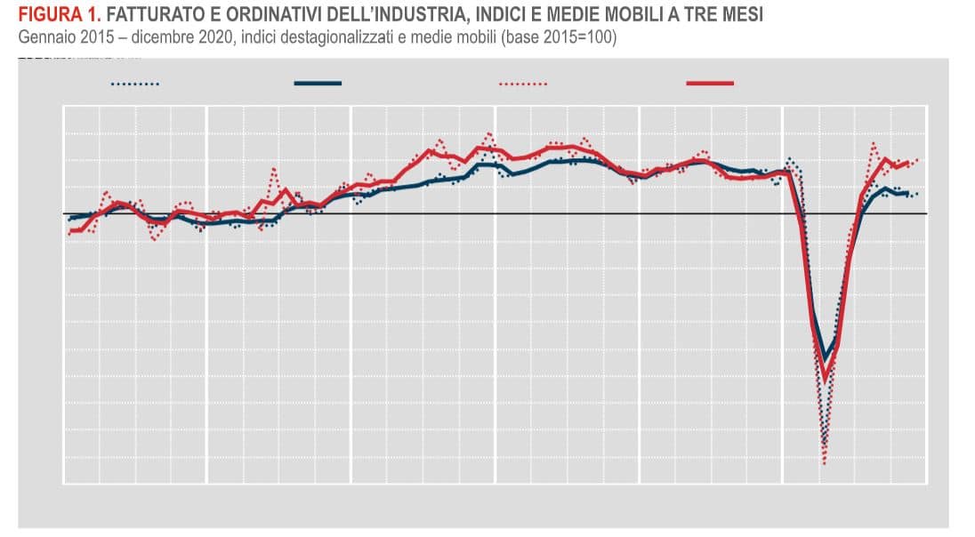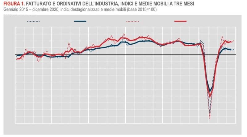 Anche gli ordinativi registrano a dicembre un incremento congiunturale (+1,7%) e nell’ultimo trimestre del 2020 aumentano del 2,6% rispetto a quello precedente. L’incremento congiunturale riflette un sostenuto aumento delle commesse provenienti dal mercato interno (+6,5%) e un significativo calo di quelle provenienti dall’estero (-4,9%).