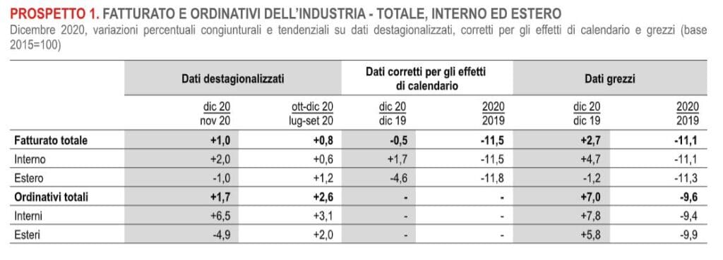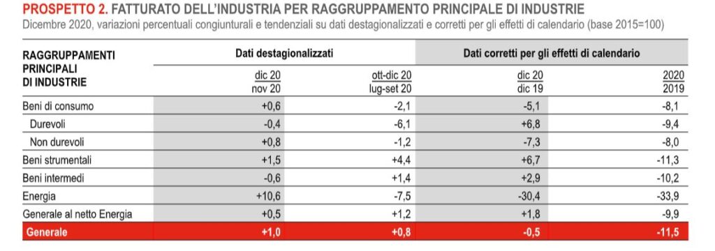 Corretto per gli effetti di calendario, il fatturato totale diminuisce in termini tendenziali (confrontato ai dati del dicembre 2019) dello 0,5%, con un incremento dell’1,7% sul mercato interno e un calo marcato su quello estero (-4,6%). A registrare la crescita tendenziale più rilevante è il settore dei mezzi di trasporto (+38,9%), seguito dall’industria metallurgica (+7,1%), mentre il comparto tessile e dell’abbigliamento e le raffinerie segnano le performance peggiori (rispettivamente -19,4% e -30,7%).