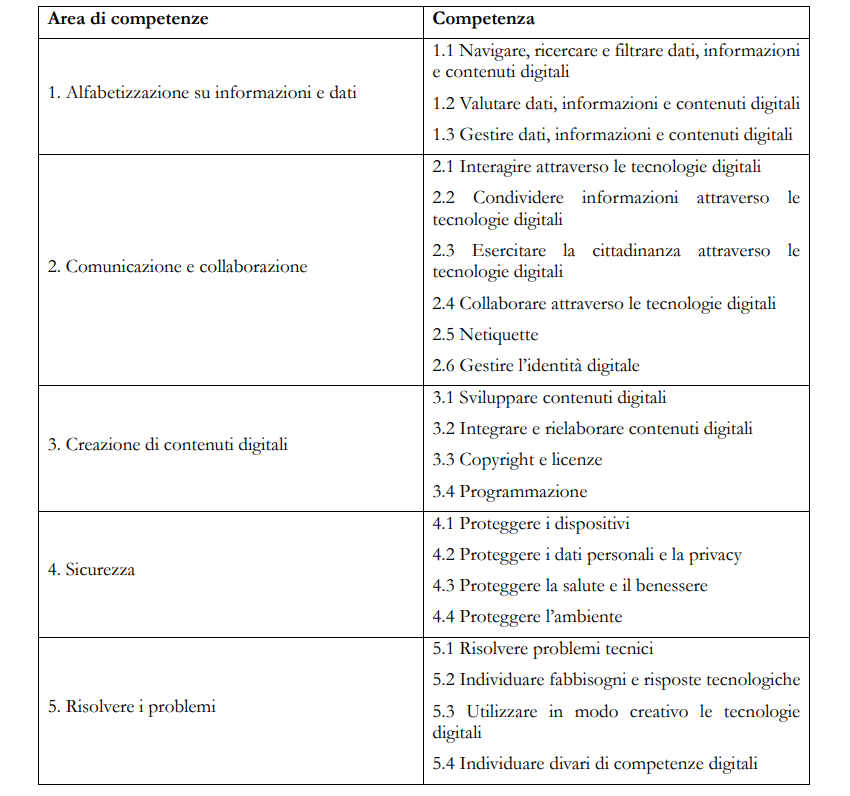 Per quanto riguarda le competenze digitali di base, le attività formative dovranno essere rivolte alla formazione delle competenze indicate nella tabella dell’allegato A dell’Avviso, che vi riportiamo di seguito.