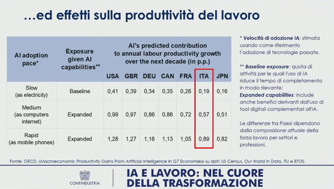 “Tale assetto la rende assimilabile alle ‘General Purpose Technologies’ storiche, quali l’elettricità e internet, sebbene il confronto con il passato evidenzi un percorso di diffusione dai contorni ancora incerti rispetto alle curve di adozione del secolo scorso”, spiega Giovanni Morleo, Adviser Area Lavoro Welfare e Capitale Umano di Confindustria.