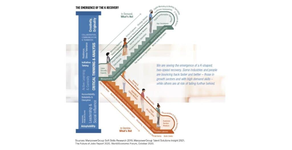 La ricerca mette in guardia sul rischio di alcune aziende di venire escluse dalla ripresa. “Ad un anno dall’inizio della pandemia, stiamo però assistendo all’emergere di una ripresa a forma di K, alcune aziende e alcune persone si stanno riprendendo più velocemente e meglio di altre – ovvero quelle nei settori in crescita e quelle ad alta competenza – mentre altre rischiano di rimanere più indietro”, commenta Jonas Prising, presidente e CEO di ManpowerGroup.