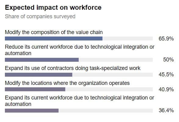 Circa il 43% delle aziende intervistate sta, infatti, pianificando di ridurre la propria forza lavoro a causa dell’integrazione tecnologica e il 41% prevede di espandere l’utilizzo dell’outsourcing per lavori specializzati.
