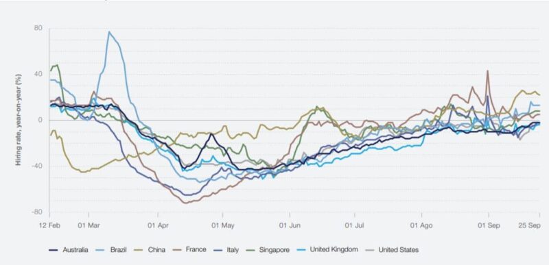 Particolarmente negativi i dati relativi alle assunzioni, che hanno seguito un trend negativo dalla prima parte del 2020 (-64,5%), con un notevole peggioramento tra aprile e maggio 2020 (rispettivamente -57% e -48%). Il dato ha poi registrato una ripresa durante il periodo estivo, fino a raggiungere un +2% nel mese di agosto, per poi ritornare in negativo a settembre -11% (dato calcolato sulla media dei primi 14 giorni del mese).