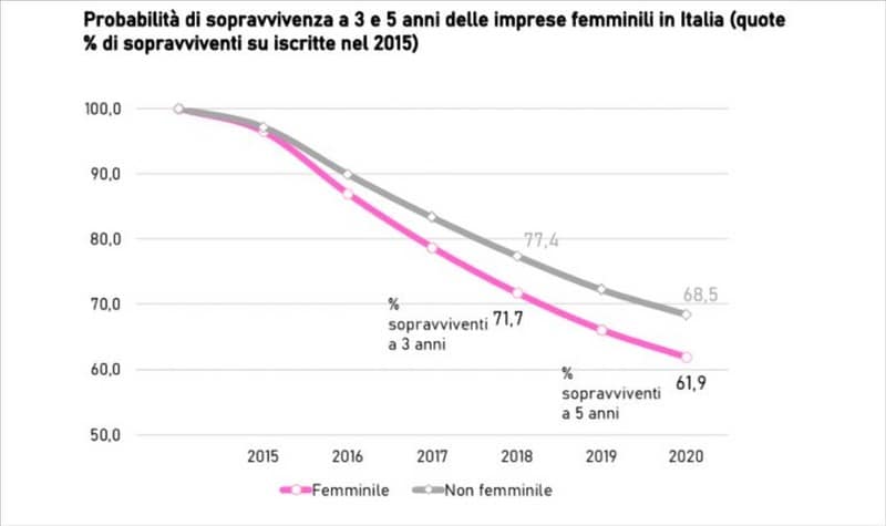 Si tratta di imprese concentrate in settori quali l’agricoltura, il commercio e gli altri servizi e che costituiscono ben il 22,0% delle imprese registrate. A preoccupare è soprattutto la fragilità di queste imprese, vista anche la minore probabilità di sopravvivenza delle imprese femminili a 3 (71.7%) e a 5 anni (61,9%) rispetto alle altre imprese.