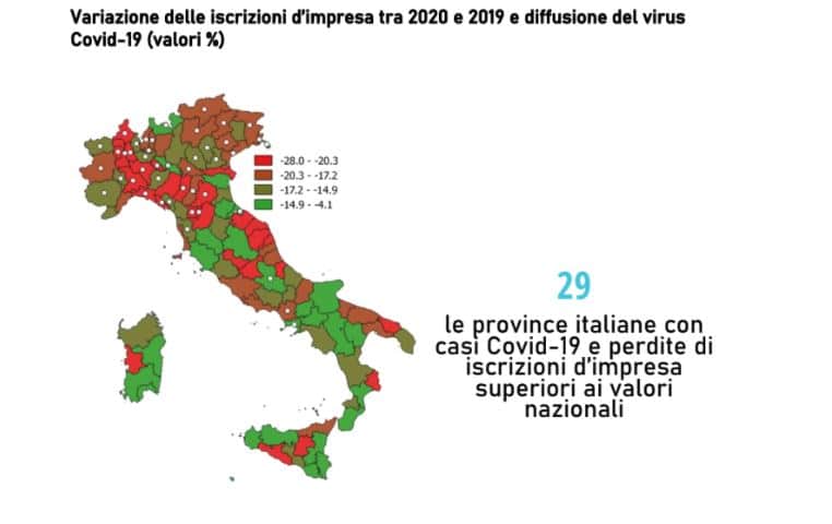La crisi ha colpito in particolare la natalità di impresa nelle regioni settentrionali, dove il virus si è diffuso maggiormente: sono in particolare 29 le province italiane (ben 24 delle quali collocate nell’Italia settentrionale) in cui la diffusione del virus si è accompagnata a una maggiore perdita di nuove imprese rispetto al 2019.