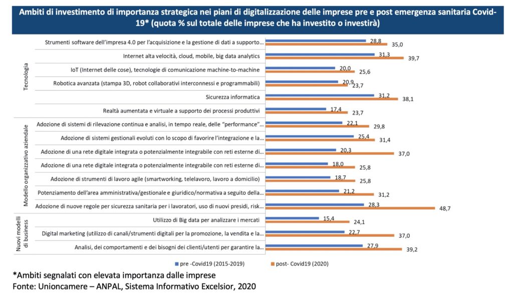 I nuovi investimenti puntano soprattutto sugli ambiti che si sono rilevati strategici nella gestione dell’emergenza: soluzioni digitali per una innovativa organizzazione del lavoro e delle relazioni con clienti e fornitori; reti digitali integrate favorite anche da una maggiore diffusione del cloud, internet ad alta velocità e tecnologie IoT; utilizzo dei Big Data, Digital marketing e più avanzata personalizzazione di prodotti/servizi.