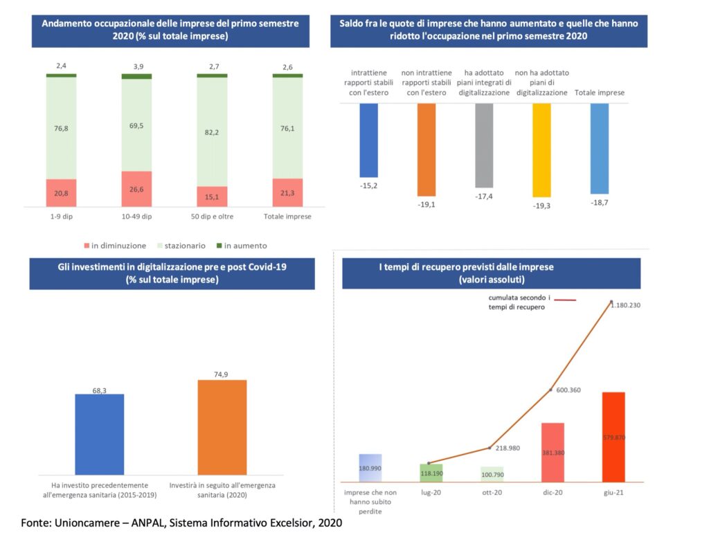 I dati dell’indagine Excelsior condotta tra il 25 maggio e il 9 giugno 2020 da Unioncamere in accordo con Anpal, mostrano un saldo negativo tra imprese che hanno ridotto e imprese che hanno aumentato il numero dei propri dipendenti pari al -18,7. Il saldo è superiore, toccando il massimo di -22,7 punti, per le imprese con 10-49 dipendenti.