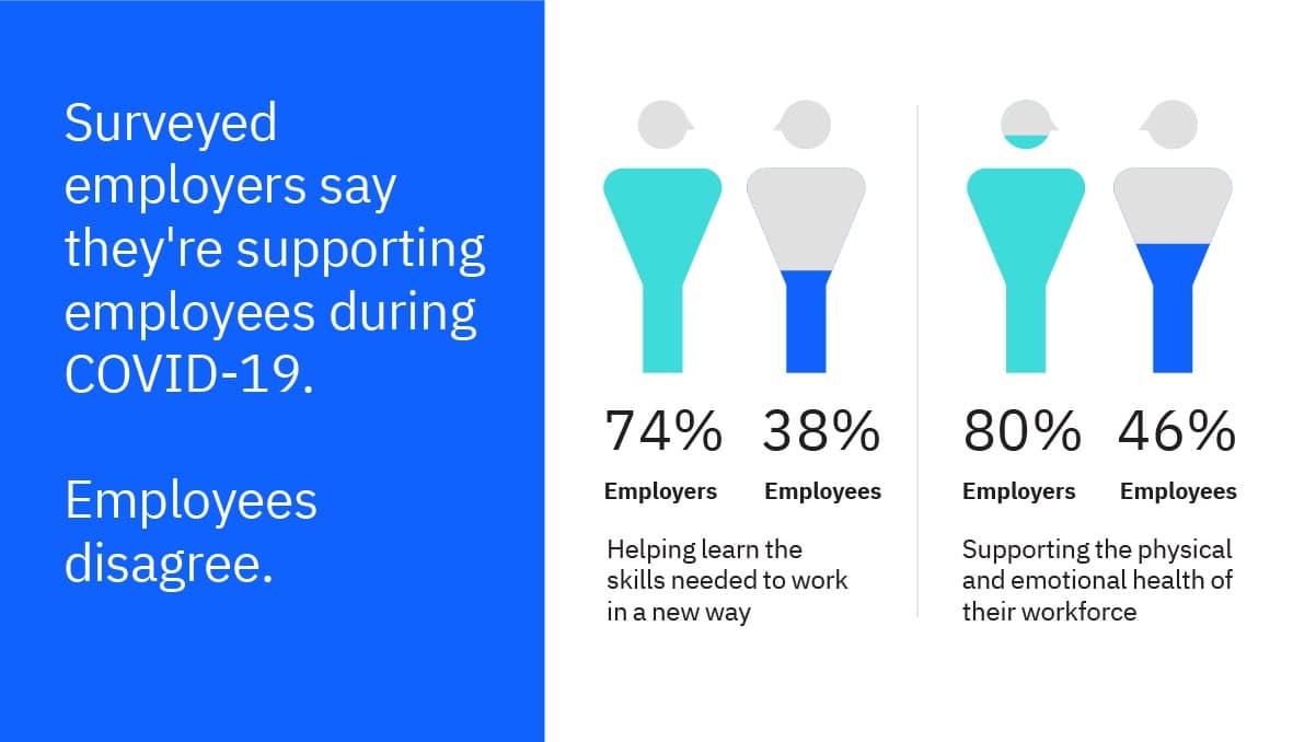 Lo studio rileva però un significativo scostamento tra le opinioni dei leader e quelle dei dipendenti circa l’efficacia del metodo utilizzato nell’affrontare tali lacune. A livello globale, il 74% dei dirigenti intervistati ritiene di aver aiutato i propri dipendenti ad apprendere le competenze necessarie per lavorare in un modo nuovo, solo il 38% dei dipendenti però concorda con questa affermazione; inoltre, l’80% dichiara di sostenere la salute fisica ed emotiva della propria forza lavoro, mentre solo il 46% dei dipendenti ritiene di aver ricevuto tale supporto.
