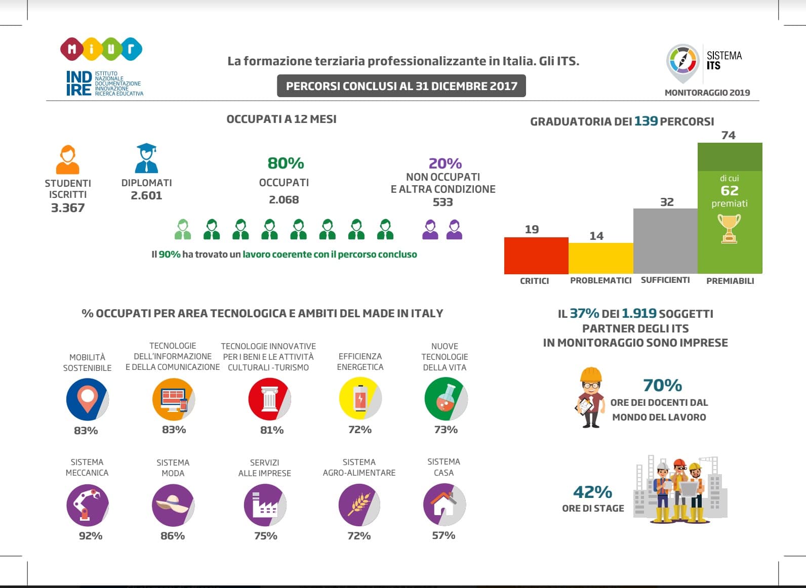 L’80% degli studenti usciti dagli ITS lavora a un anno dal diploma. È uno dei dati che emergono dal Monitoraggio nazionale 2019 sul Sistema ITS effettuato dal Ministero dell’Istruzione, università e ricerca.