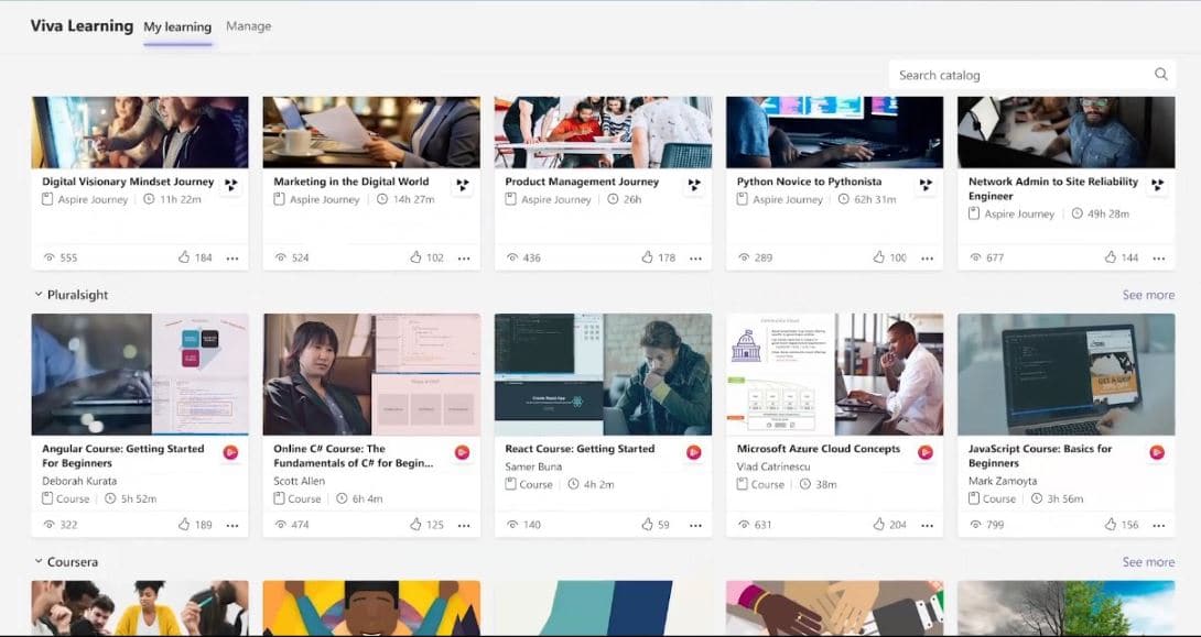 - Viva Learning, che rende le opportunità di formazione e sviluppo professionale più accessibili nel flusso di lavoro. Questa funzionalità aggrega tutte le risorse di apprendimento disponibili per un’azienda in un unico luogo, compresi i contenuti di LinkedIn Learning, Microsoft Learn, fornitori di terze parti tra cui Skillsoft, Coursera, Pluralsight ed edX, oltre al portfolio di contenuti dell’azienda. L’app Viva Learning è ora disponibile in anteprima privata e, a partire da quest’anno, offrirà integrazioni con i principali sistemi di gestione dell’apprendimento tra cui Cornerstone OnDemand, Saba e SAP SuccessFactors.