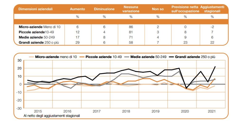 Le previsioni cambiano anche in relazione alla dimensione dell’organizzazione: i datori di lavoro delle grandi imprese prevedono un positivo aumento delle aspettative di assunzione nel prossimo trimestre, con una prospettiva di occupazione netta del +22%. Anche i datori di lavoro di medie e piccole imprese si aspettano un aumento favorevole delle assunzioni con previsioni del +6% e +7%. Tuttavia, i datori di lavoro delle microimprese si aspettano di ridurre il livello di occupazione del -2%.