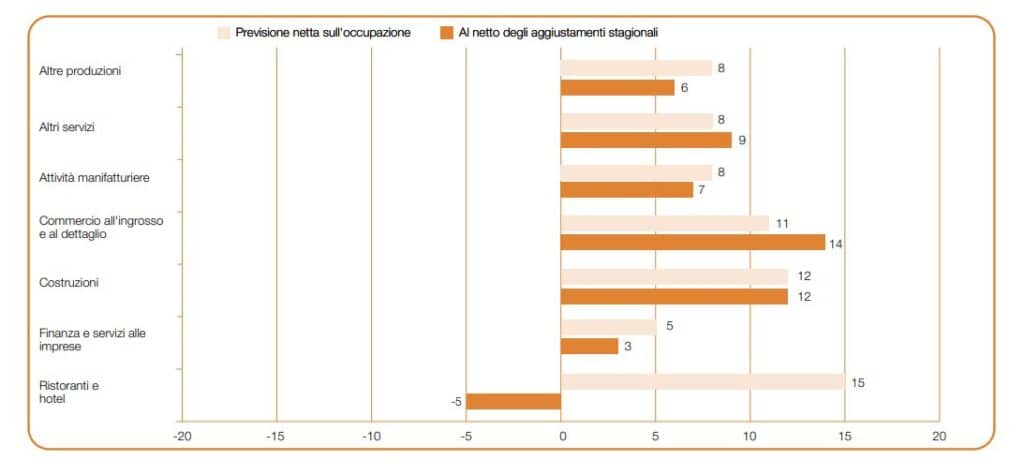 A livello settoriale, si prevede che l’aumento riguarderà sei sui sette settori industriali analizzati. Le previsioni maggiori di assunzione si rilevano nel settore commercio all’ingrosso e al dettaglio, con una previsione di occupazione netta del +14%.