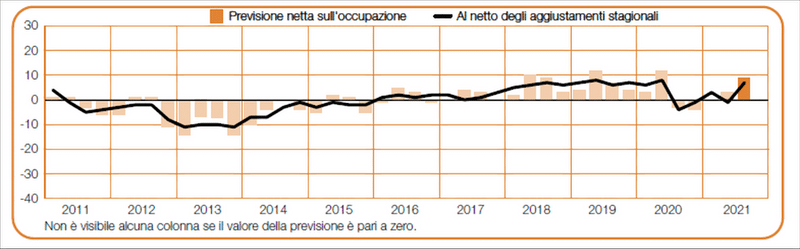 Le prospettive di occupazione, al netto degli aggiustamenti stagionali, sono pari a +7%. Le previsioni di assunzione migliorano di 8 punti percentuali rispetto al trimestre precedente e di 11 punti percentuali rispetto allo stesso trimestre di un anno fa.