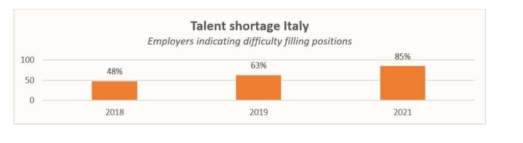 Un miglioramento che, tuttavia, si accompagna a un dato tutt’altro che favorevole: quello relativo al talent shortage, ovvero alla mancanza di figure in possesso delle competenze necessarie alle imprese, che in Italia raggiunge l’85%. Il valore più alto degli ultimi 15 anni.