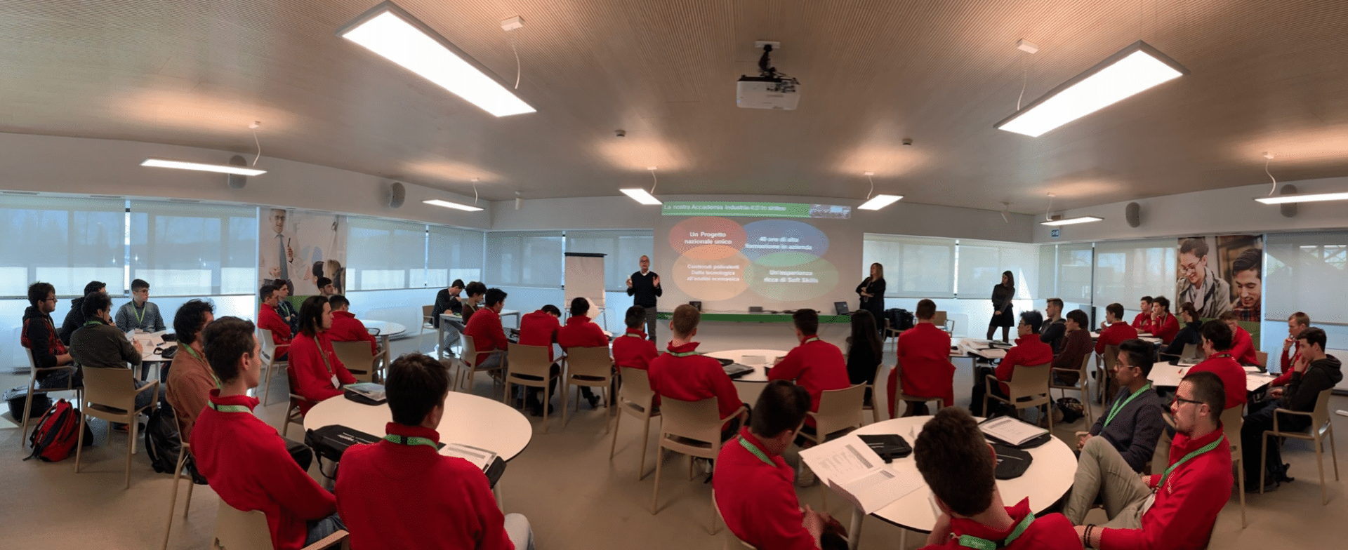 Durante l’Accademia formativa, 36 studenti provenienti dall’ITS Meccatronico Veneto (Sede di Padova e Vicenza, corso Tecnico Superiore per l’Automazione e i sistemi meccatronici) e dall’ITS Kennedy (sede di Padova) per il corso Sviluppatore Apps Mobile, sono stati ospiti della sede direzionale di Stezzano (BG) di Schneider Electric per quattro giorni di formazione intensiva, realizzata a contatto con manager e specialisti dell’azienda e impostata con un approccio interdisciplinare, che riflette l’esigenza di creare figure professionali in grado di integrare competenze tecnico-applicative di diverso tipo.