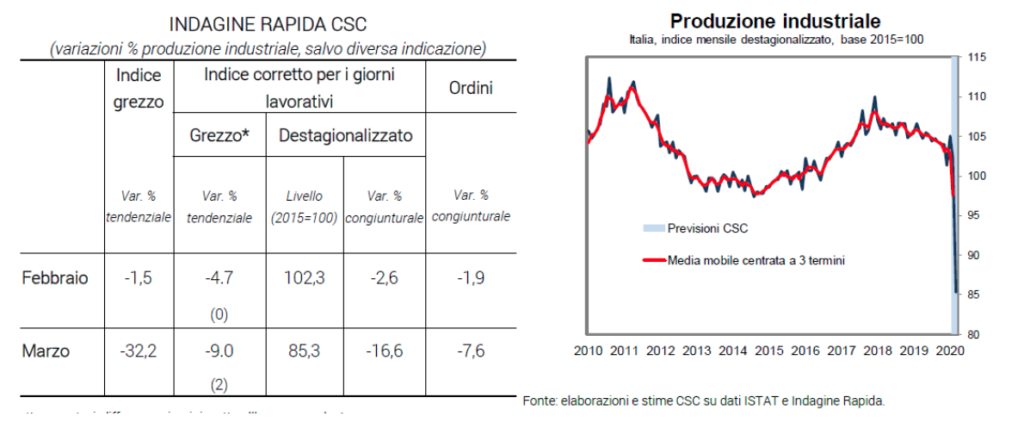 L’effetto sulla produzione industriale si è fatto sentire: come si è detto, il Centro Studi di Confindustria stima un calo della produzione industriale di marzo pari al 16,6% congiunturale rispetto a febbraio. Un dato che, se confermato dall’Istat, rappresenterebbe il più alto crollo mensile da quando si fa questo tipo di analisi, ovvero dal 1960 con i livelli produttivi che tornerebbero a quelli di marzo 1978.