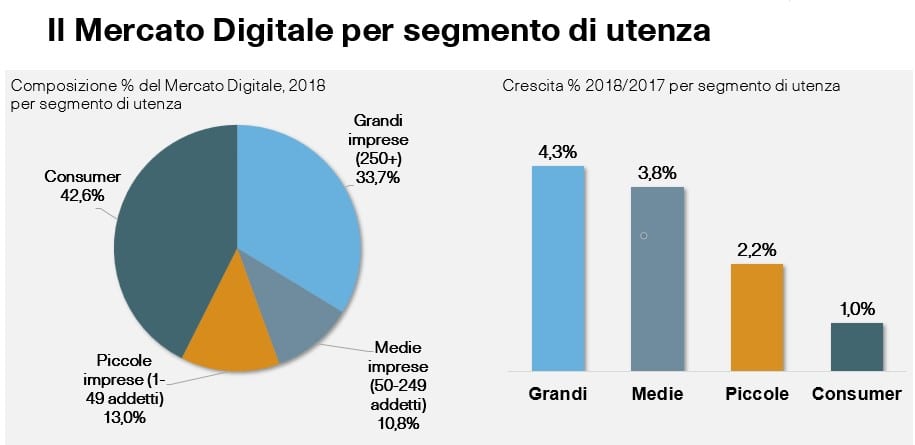 “Se guardiamo invece al mercato Digitale italiano nel 2018 per segmenti di utenza”, sottolinea Giancarlo Capitani, presidente di NetConsulting Cube, “il primo in valore è quello Consumer, che rappresenta circa il 43% del totale, e cresce dell’1%. Seguono poi le grandi imprese, con un terzo del mercato, e un incremento del 4,3%, le piccole imprese con il 13% del totale, e le medie aziende con un decimo”.