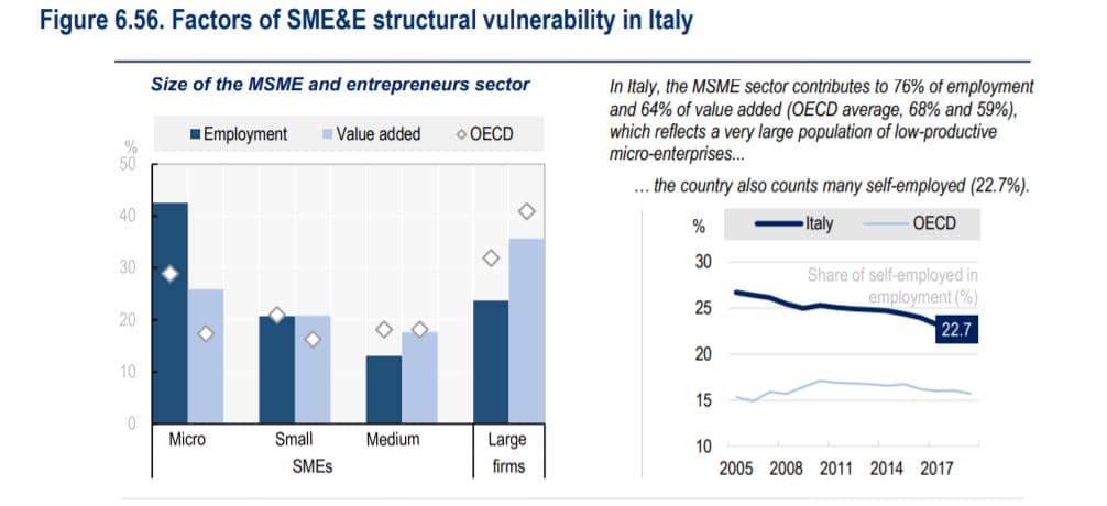 Il focus sull’Italia, oltre a ricapitolare tutti gli strumenti adottati a supporto delle PMI e gli interventi strutturali finora adottatati dal Governo, mette in evidenzia le potenzialità e le debolezze del nostro sistema imprenditoriale.