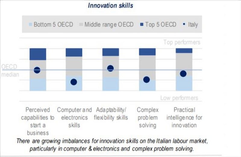 Tra le criticità ancora presenti, sottolineate dal rapporto, troviamo proprio il divario nell’adozione delle tecnologie digitali (soprattutto nell’e-commerce, ancora non sufficientemente diffuso tra le PMI), gli alti costi amministrativi e di insolvenza (che costituiscono un ostacolo alla nascita di nuove imprese) e il sempre maggiore squilibrio nelle competenze che possiede la forza lavoro, con le competenze in informatica, elettronica e problem solving tra le meno presenti.