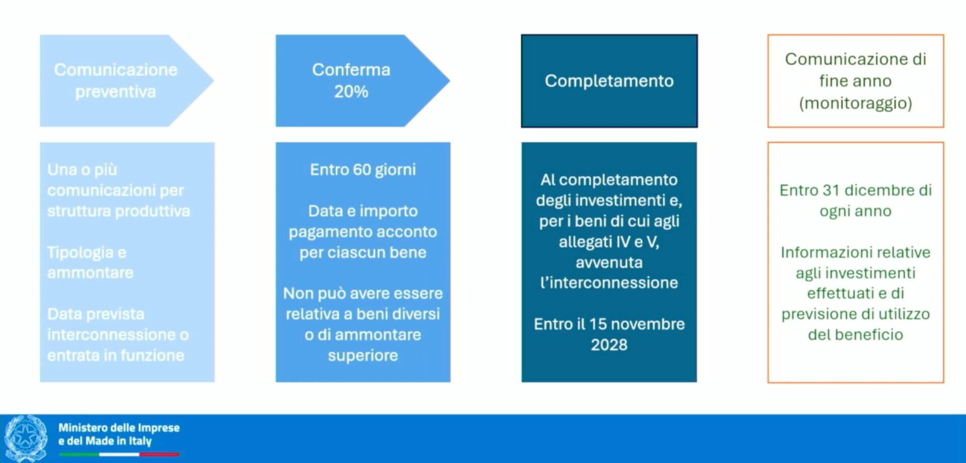 E passiamo alla novità principale, che riguarda la comunicazione di completamento, da inviare appunto al completamento degli investimenti e comunque non oltre il 15 novembre 2028. Questa comunicazione – ha spiegato Calabrò – potrà riguardare anche una parte dei beni indicati nelle prime comunicazioni, procedendo poi a una seconda comunicazione di completamento per gli altri beni. La data di fruizione dell’incentivo corrisponderà all’esercizio relativo all’anno di effettuazione dell’investimento, ma la fruizione potrà partire, naturalmente, solo dopo l’interconnessione.