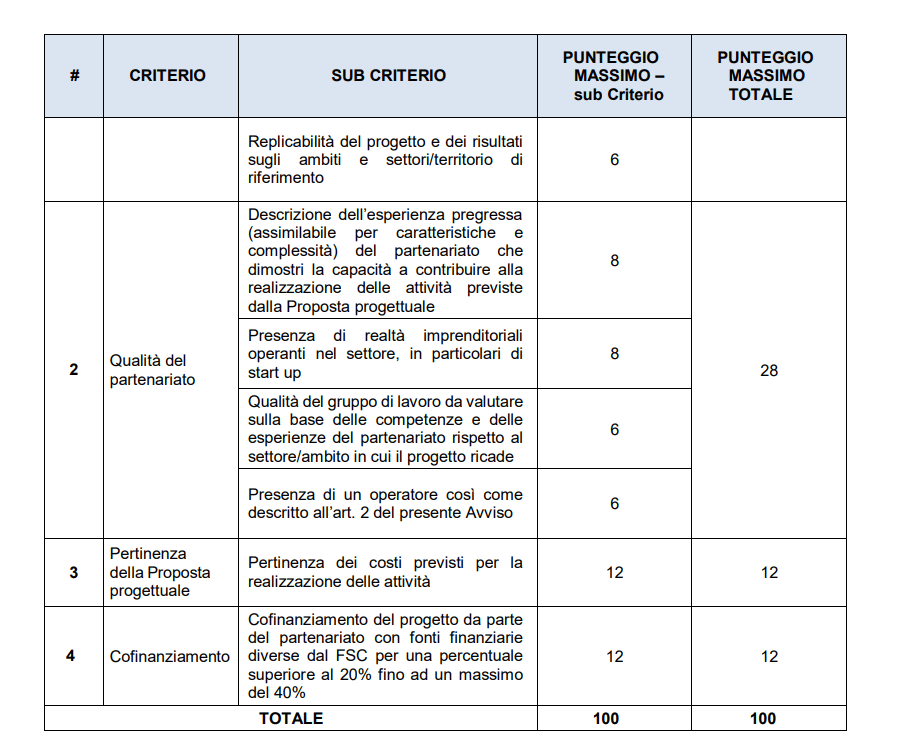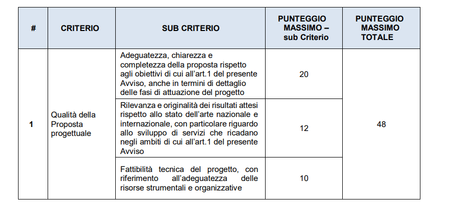Le domande che rispettano i contenuti elencati saranno ammesse alla fase di valutazione sulla base dei criteri riportati nelle tabelle sottostanti: